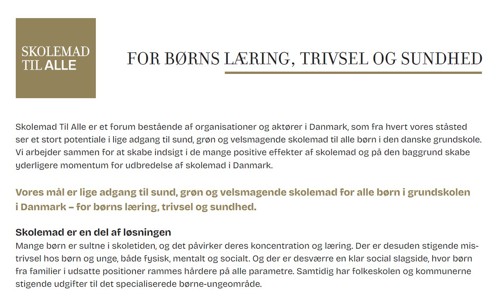 Forum for Skolemad til Alle er et uformelt forum, der sammen sætter fokus på de mange positive effekter af skolemad, for på den måde at skabe momentum for udbredelse af skolemad i Danmark.